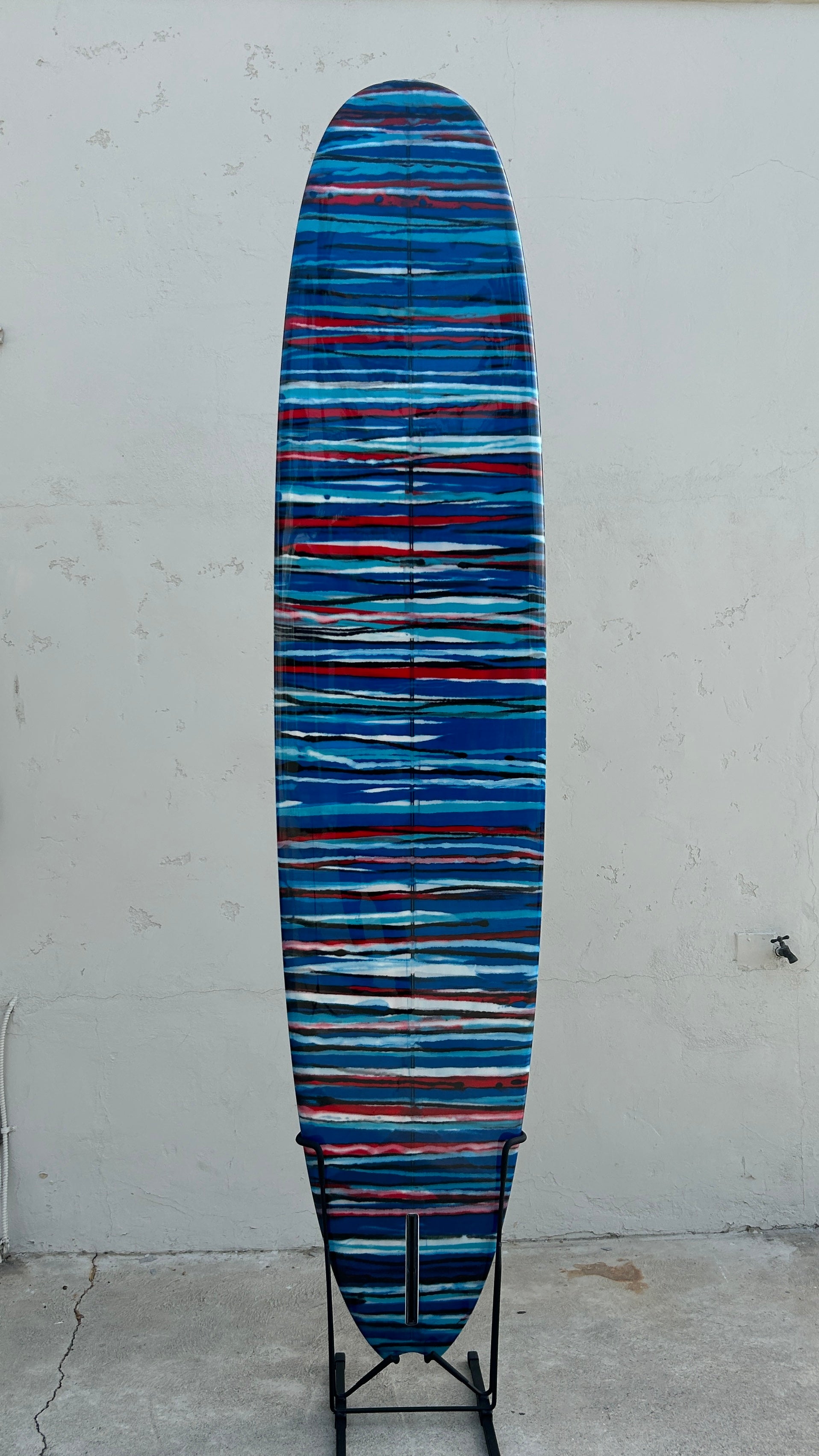 Blue Mexican blanket resin tint splash. T-band stringer, glassed in all 6oz. Single fin box, mild concave nose. Red pin line and a swallow tail.